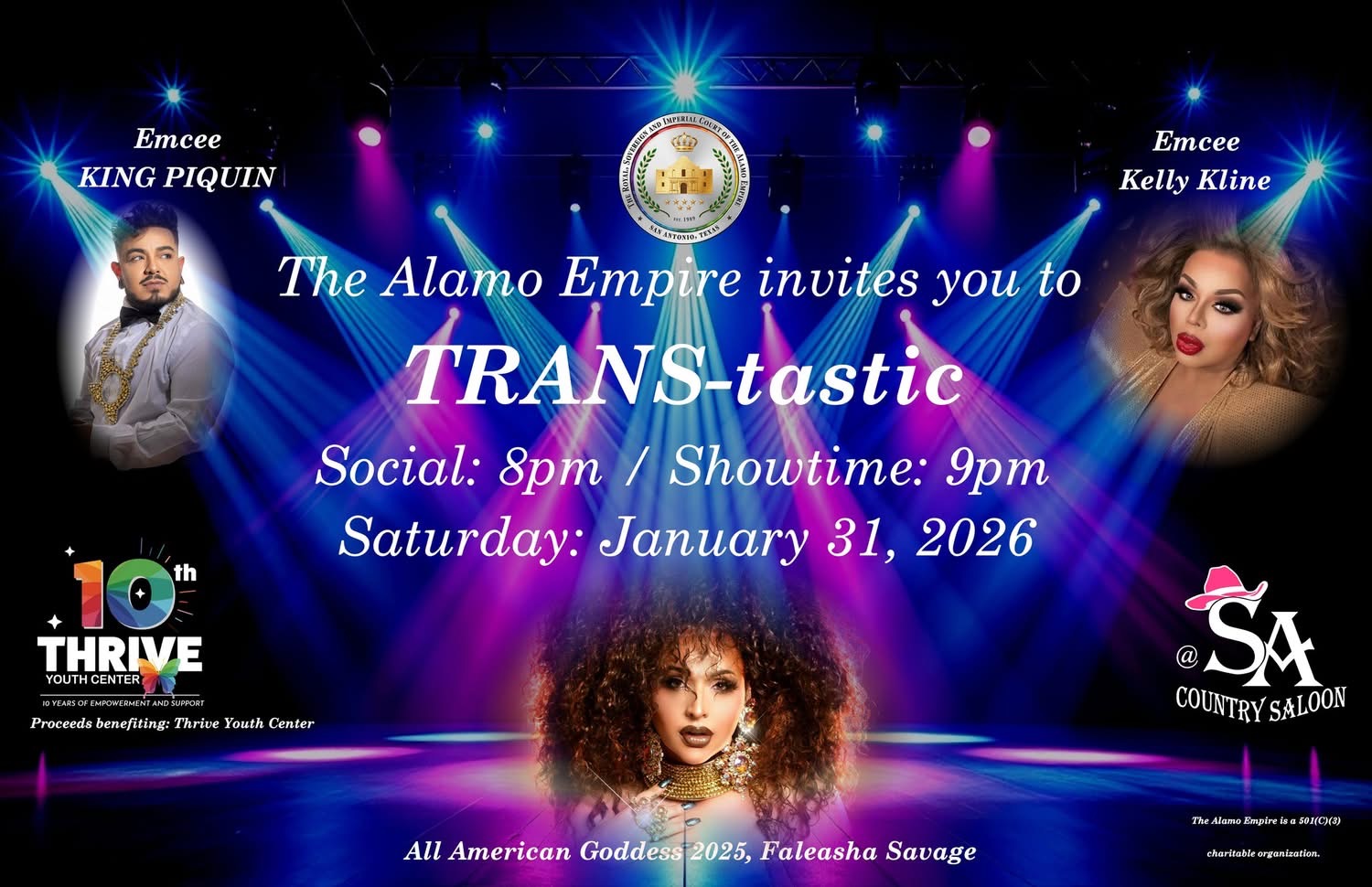 Please join the Alamo Empire, Inc. on Saturday, 31 January 2025 for our TRANS-tastic Show at SA Country Saloon (1134 W Hildebrand Ave. San Antonio, TX 78201) The social hour will be from 8:00 PM to 9:00 PM and the show will start at 9:00 PM. The show will be emceed by Mr. Texas Forever, King Piquin & The Wonder Woman of Drag, Miss Kelly Kline and is being produced by Empress Emeritus The Lovely Michele.