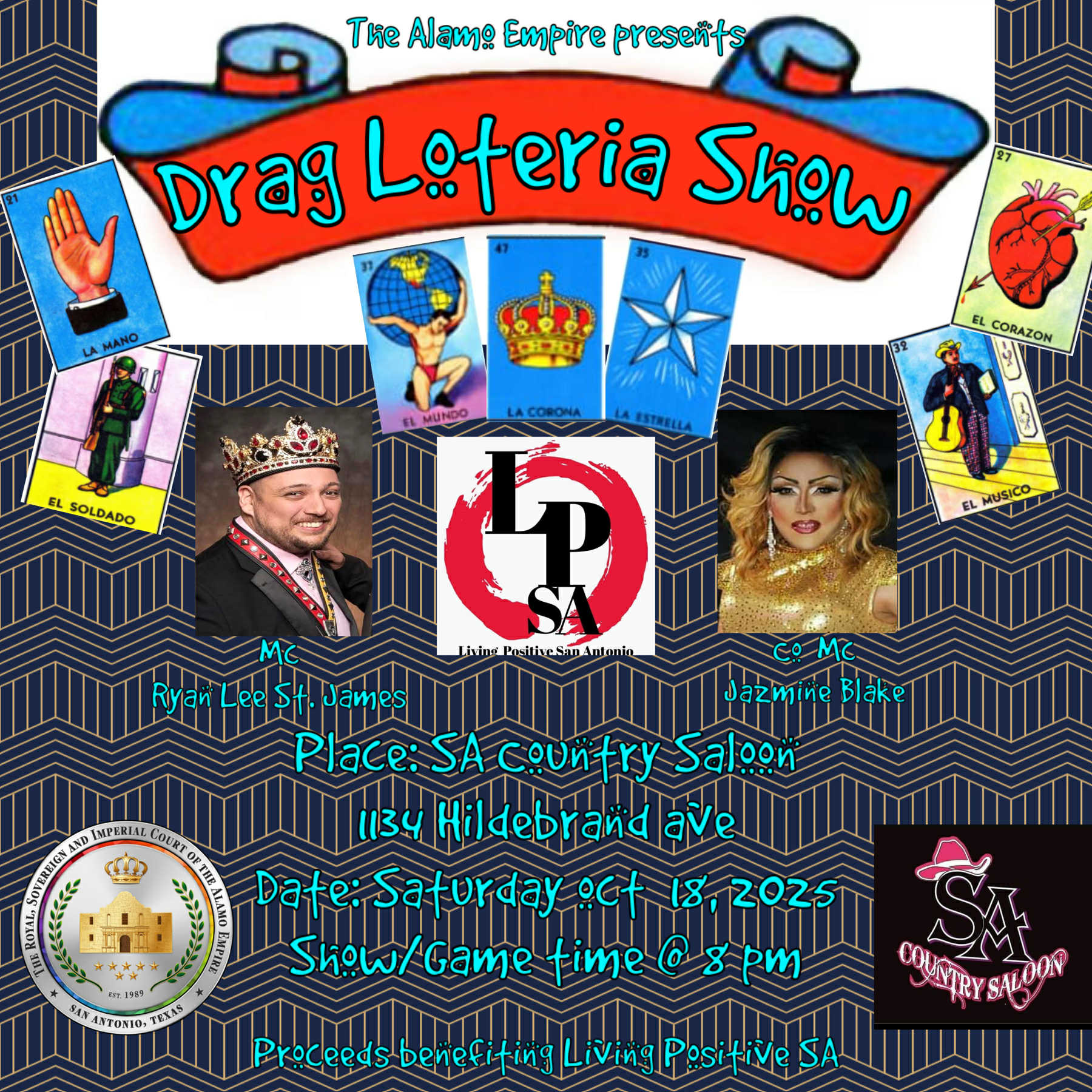 Please join the Alamo Empire, Inc. on Saturday, 18 October 2025 for our Drag Loteria Show at SA Country Saloon (1134 W. Hildebrand Ave., San Antonio, TX 78201). The show will start at 8 pm. The show will be emceed by Grand Duke 50 of the United Court of the Lone Empire (Dallas) Ryan Lee St. James and Princess of the Alamo Empire Jazmine Blake.
