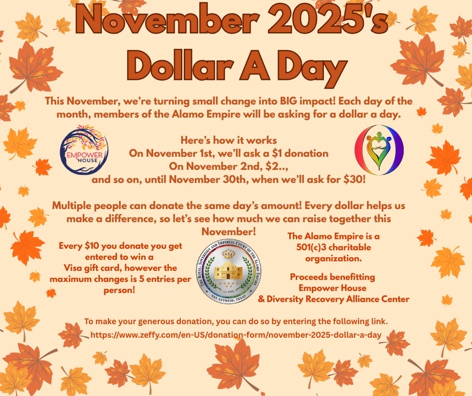 Please join the Alamo Empire, Inc. for a special fundraiser during the month of November called “November 2025 Dollar A Day”.