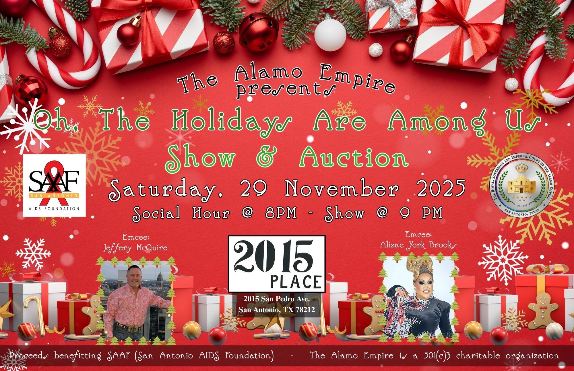 Please join the Alamo Empire, Inc. on Saturday, 29 November 2025 for the “Oh, The Holidays Are Among Us” Show & Auction at 2015 Place (2015 San Pedro Avenue, San Antonio, Texas 78212). The social hour will be from 8:00 PM to 9:00 PM and the show will start at 9:00 PM. The show will be emceed by Emperor 29 of The Imperial Court de Fort Worth/Arlington Jeffery McGuire & Miss Sin City America 2022 Alizae York Brooks.