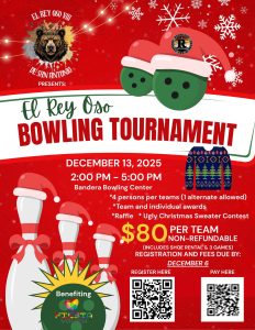 Gather your friends and join us for some fun at the El Rey Oso Bowling Tournament! Each team will consist of four members, with one alternate allowed in case someone can’t make it on tournament day.