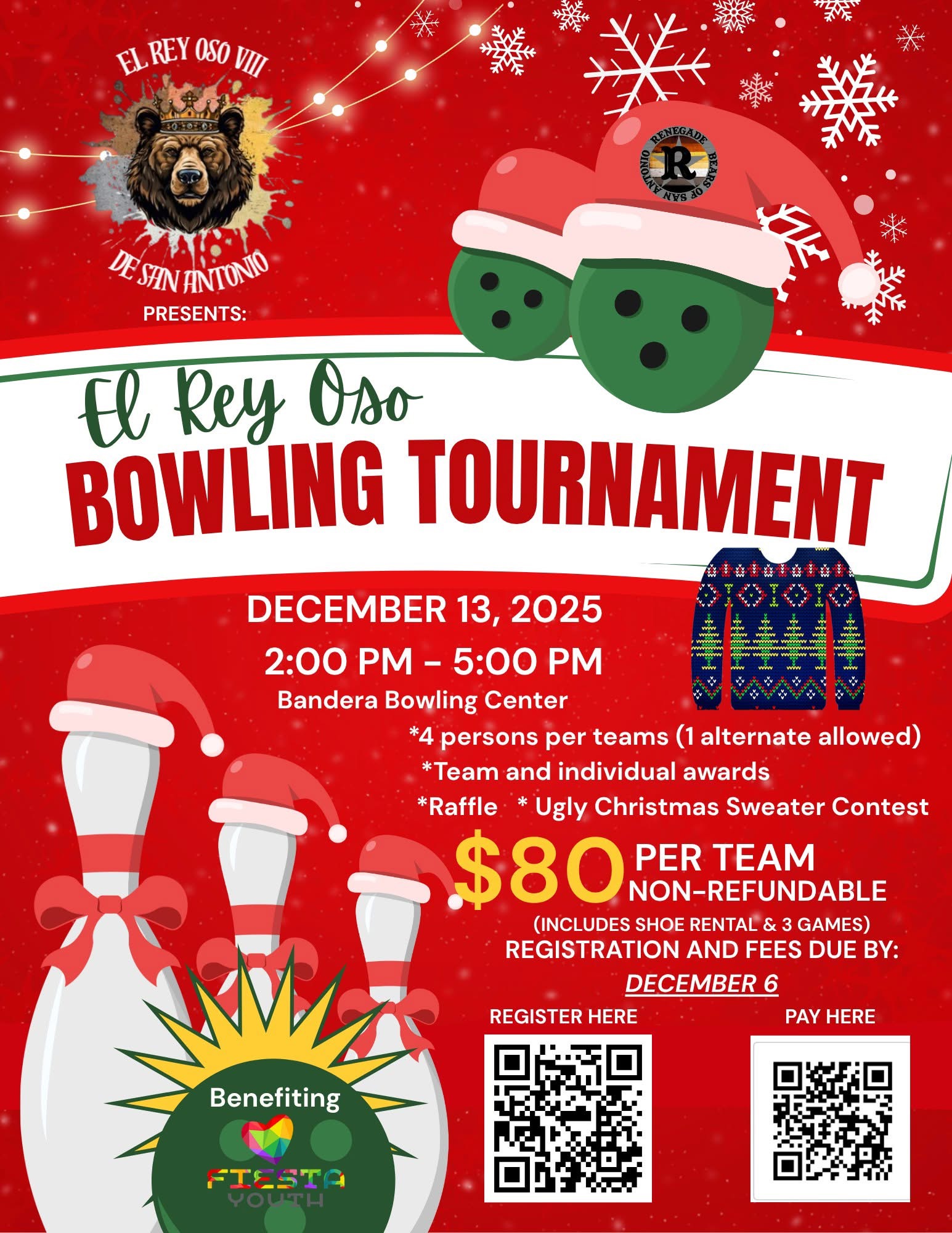 Another fun event being put on by El Rey Oso and the Renegade Bears. El Rey Oso VIII, Frank, is raising money this year to benefit Fiesta Youth. All the details are below. Teams of 4 for $80 so that’s $20 per person. Each team can add a fifth person as an alternate, but only 4 can play in the tournament. One person will need to register your team and pay the $80 and the other team members will need to reimburse the person who pays. This is sure to be a fun event and another opportunity to support one of our other San Antonio CommUNITY organizations. Hope you’ll all consider joining in and supporting. It’s all about having FUN as we celebrate the holiday season.